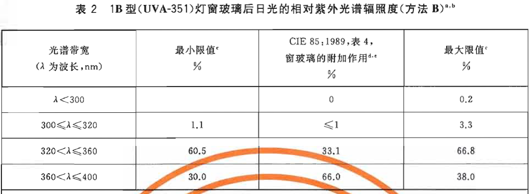a 本表給出了在給定帶寬內的輻照度占290nm~400nm總輻照度的百分比,要檢測一個典型的1B型(UVA-351)燈是否符合本表要求,應測量250nm~400nm的光譜輻照度。然后將每一帶寬內的總輻照度加和,再除以290nm~400nm間的總輻照度。
