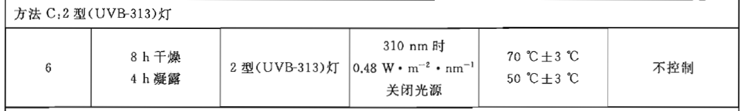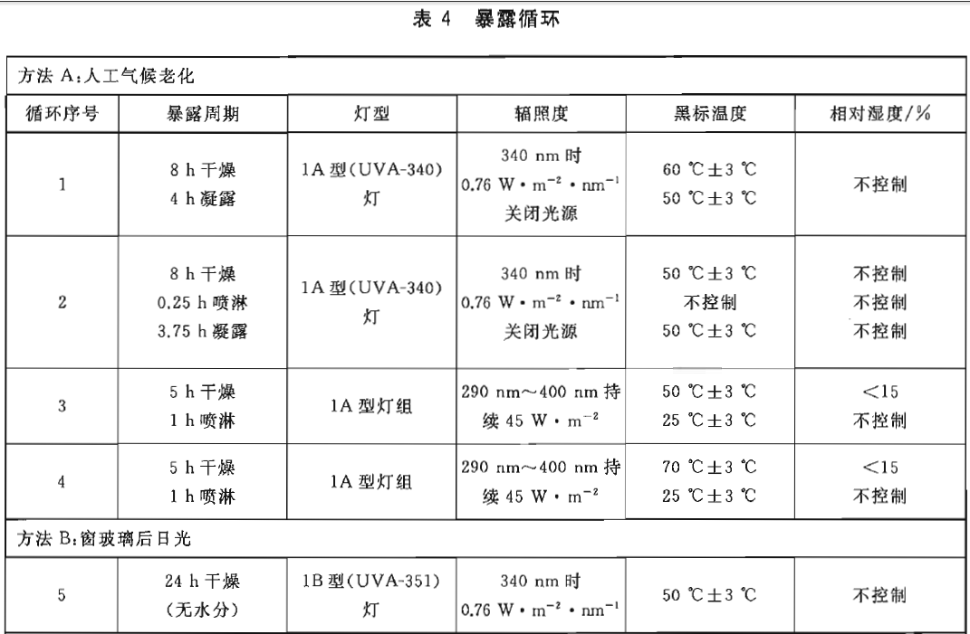 表4給出了人工氣候老化(方法A)、窗玻璃后日光(方法B)和2型(UVB-313)燈(方法C)進行試驗的多組暴露循環(huán)條件。